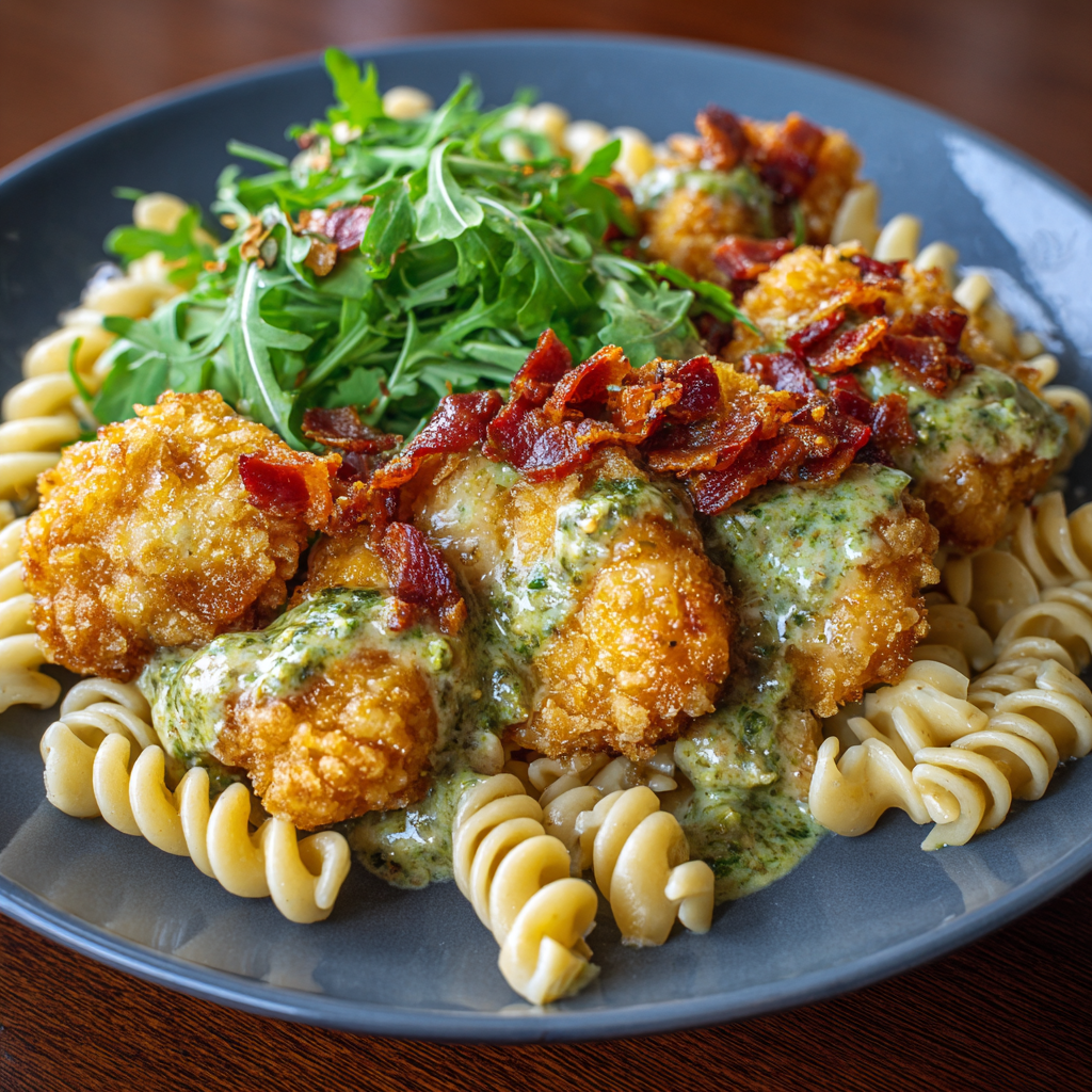 Premium gluten-free crispy breaded chicken bites with pesto cream sauce, served with spaghetti noodles topped with a sprinkle of bacon and arugula.