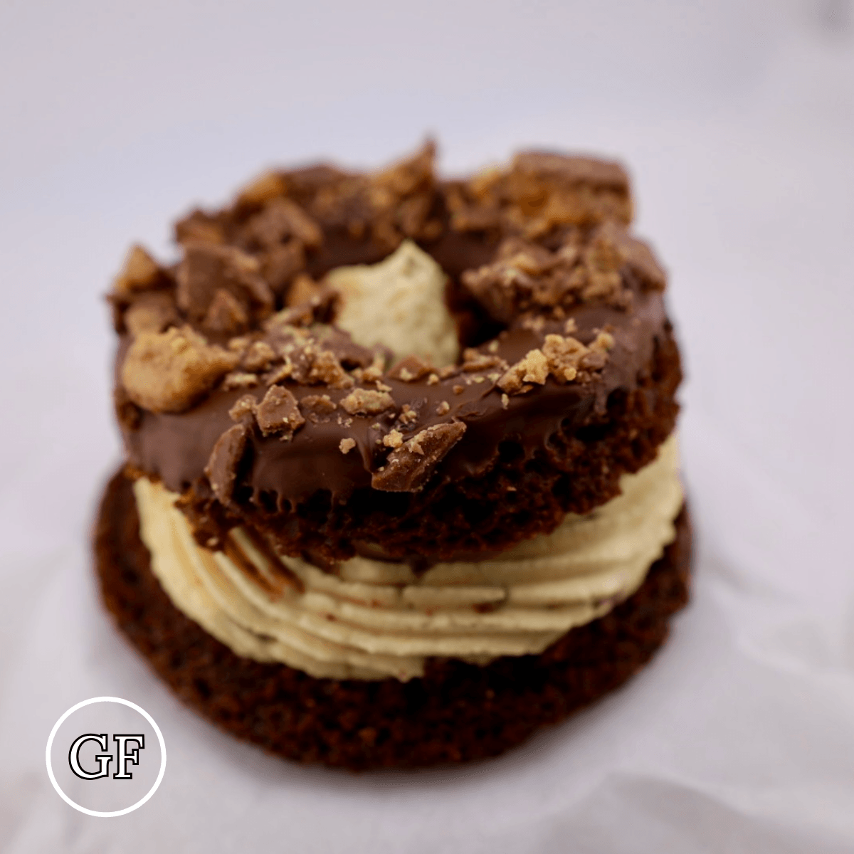 A Clean Cheatz Ol' Dirty Bastard donut split in half and filled with protein packed PB2 sugar-free whipped pudding.