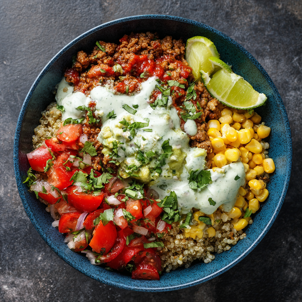 Our Southwest Taco Turkey Bowl features lean ground turkey expertly seasoned with classic taco spices, served atop a vibrant bed of cilantro lime quinoa. This nutritious base is complemented by protein-rich black beans, fresh pico de gallo, and smoky fire-roasted corn. Finished with a signature house-made poblano crema, this bowl delivers a balanced blend of flavors and textures perfect for a satisfying, wholesome meal.